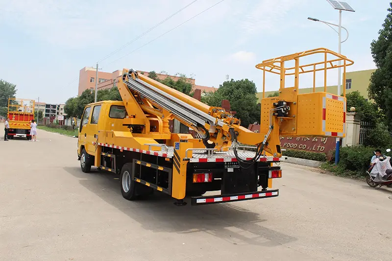 Der Ausleger und die Stützen des 15-21 m langen Teleskopausleger-Hubarbeitsfahrzeugs bestehen aus niedriglegierten Q345-Profilen, ohne Schweißnähte und mit hoher Festigkeit; Die Ausleger sind flexibel zu bedienen, der Drehtisch kann um 360° in beide Richtungen gedreht werden, ist mit einem elektrisch gesteuerten Hubarm und zwei Sätzen oberer und unterer Bedienplattformen ausgestattet, sicher und bequem.